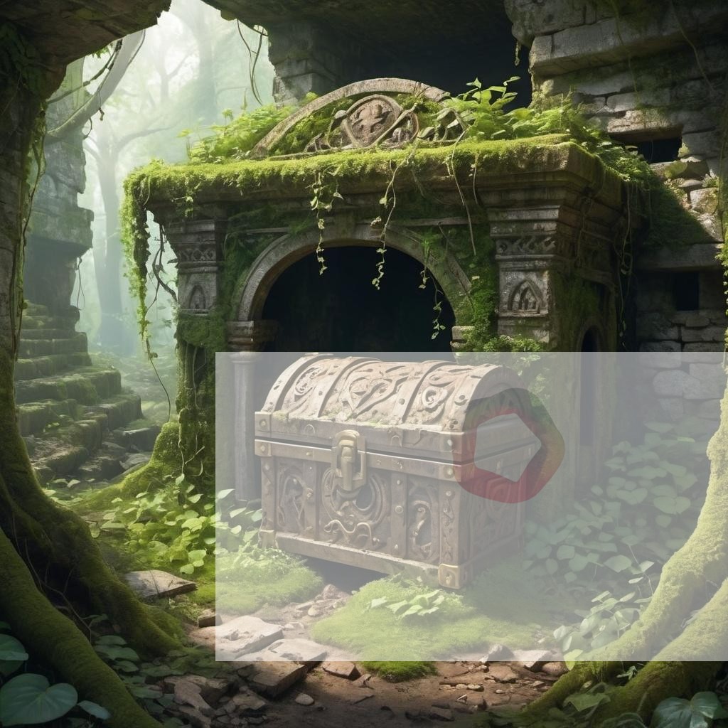 An ancient ruin overgrown with vines and moss with a mysterious treasure chest half-buried in the ground