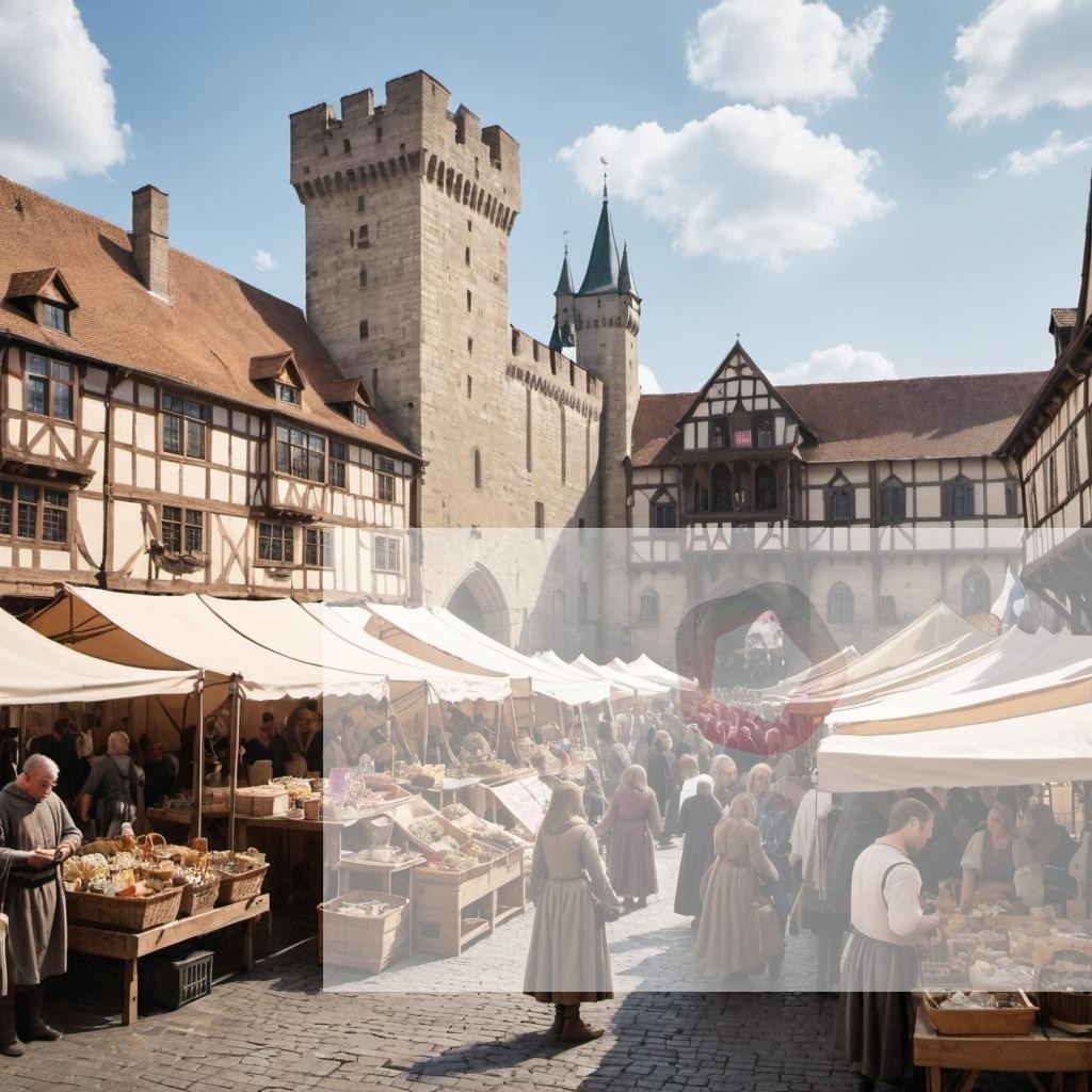 This image showcases bustling medieval market square filled with people, stalls selling various goods, and a castle in the background, capturing its essence with vivid details and an engaging atmosphere, ideal for enhancing various creative projects.
