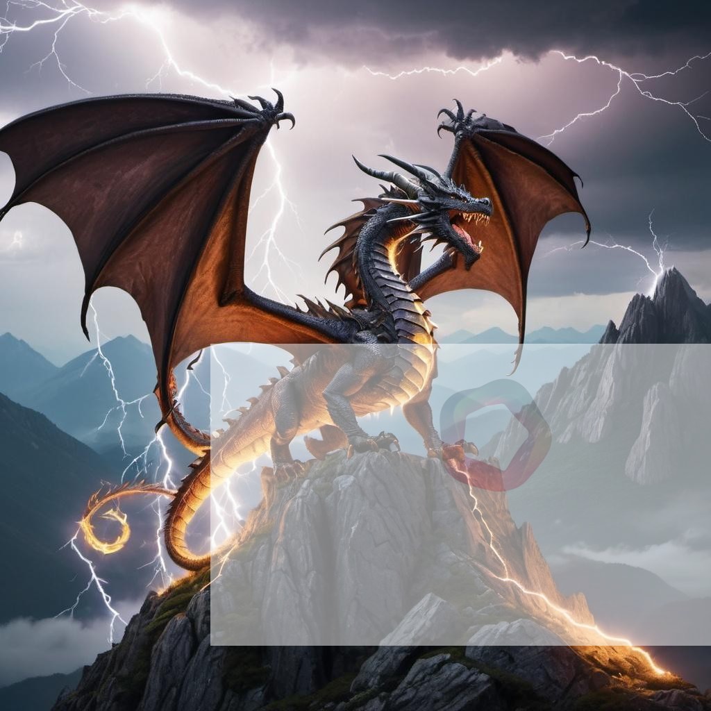 This image showcases fantasy dragon perched on a mountain peak, its wings spread wide, with lightning flashing in the background, capturing its essence with vivid details and an engaging atmosphere, ideal for enhancing various creative projects.