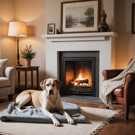 A cozy living room with a fireplace, a sleeping dog, and a blanket