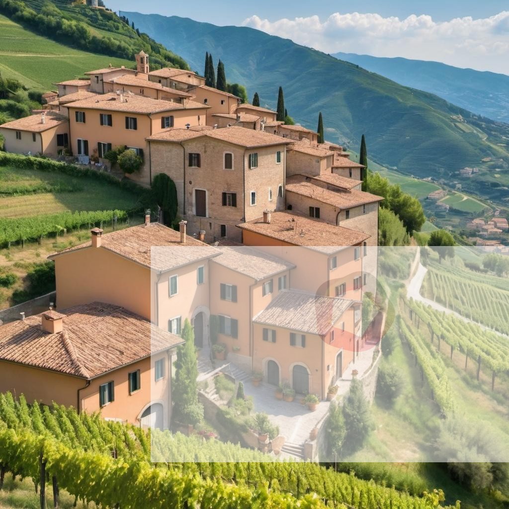 picturesque Italian village on a hillside, with terracotta rooftops, narrow winding streets, and vineyards