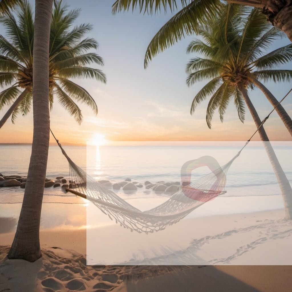 This image showcases tranquil beach scene at sunset with gentle waves, palm trees swaying, and a hammock tied between two trees, capturing its essence with vivid details and an engaging atmosphere, ideal for enhancing various creative projects.